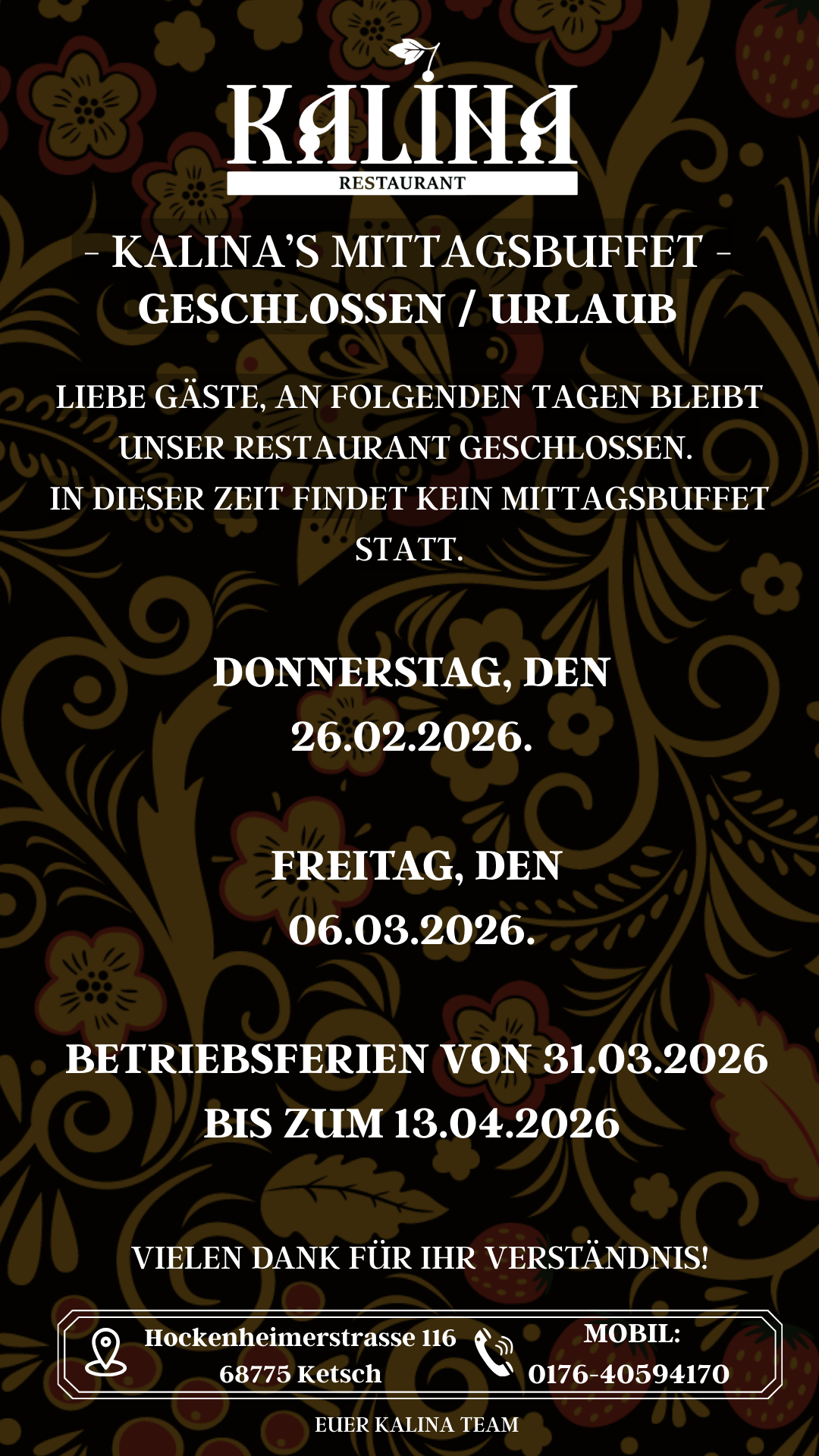 Entdecken Sie unser beliebtes Mittagsbuffet im Restaurant Kalina in Ketsch – das Highlight für Rentner, Familien, Schüler und Berufstätige, die in ihrer Mittagspause oder nach dem Vormittag etwas Gutes essen möchten.